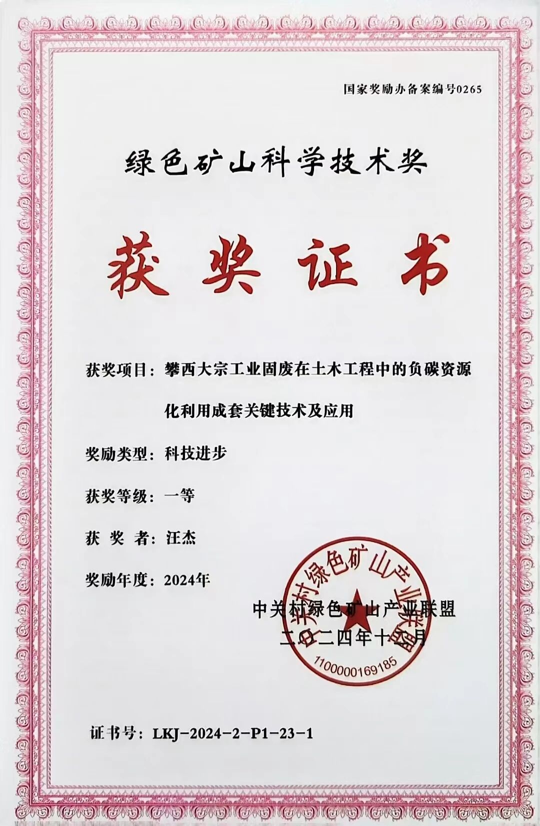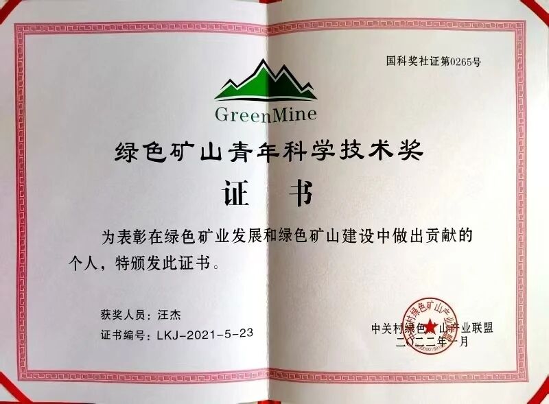 近年来,汪杰团队在绿色矿山领域屡获突破:2024年获绿色矿山科学技术奖一等奖的《攀西大宗工业固废在土木工程中的负碳资源化利用成套关键技术及应用》,为多源固废资源化利用找到新途径,并且已在攀枝花多项工程中应用,实现了经济与生态双赢;获“绿色共享与循环利用贡献奖”二等奖的《攀钢大宗固废高钛型高炉渣土木工程综合利用成套关键技术与应用》,针对攀钢钒钛冶炼产生的高钛型高炉渣在土木工程中多途径应用,提升工程性能,降低建设成本,开展系列研究工作,成功推动高钛型高炉渣建材化大规模利用;他在2023年获得“全国冶金矿产固废资源化∙优秀青年”、2022年获得“绿色矿山青年科学技术奖”;同时,他被聘为“中关村绿色矿山产业联盟”科技特别专员委员会委员、区域(西部)委员会主任委员、“全国低碳胶凝材料与低碳混凝土技术联盟”委员会委员。