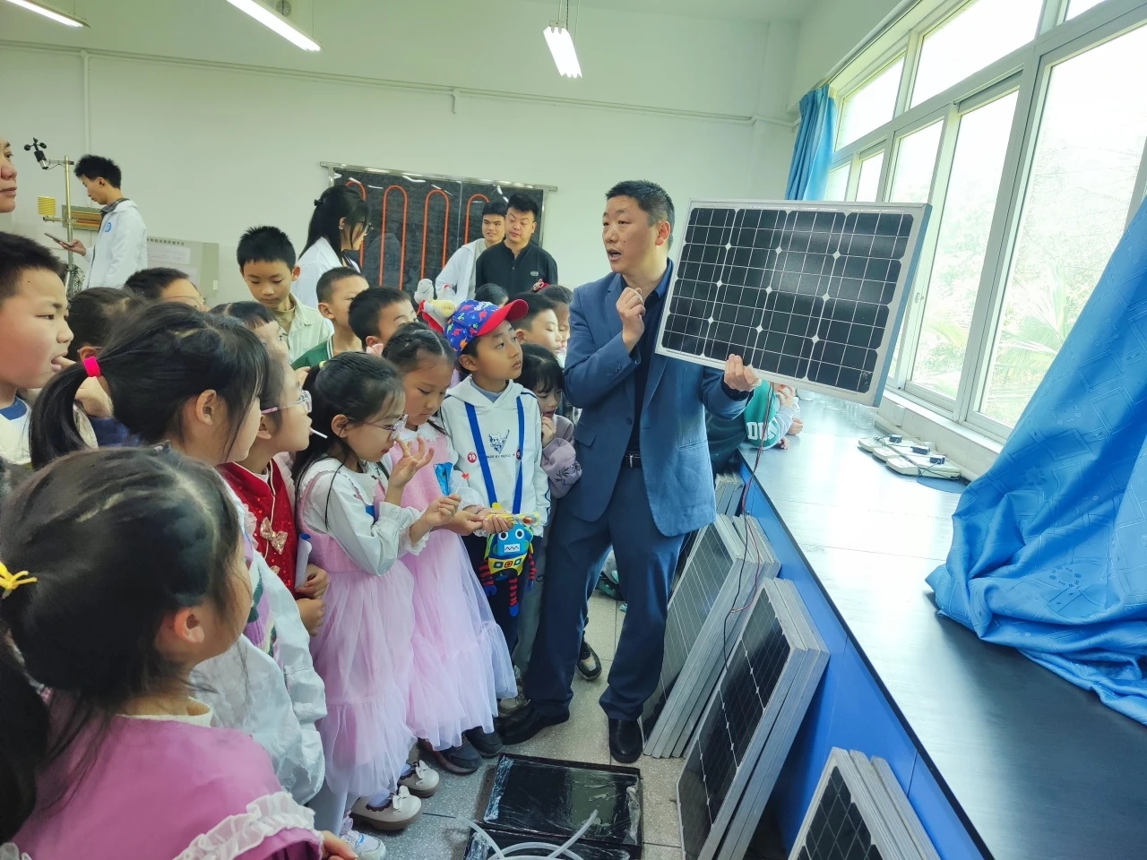 徐众重视实践教学,他曾说:“知识不落地,就是空中楼阁。”他会在周末带领学生深入乡村开展暑期社会实践,为村民检修水泵、更换路灯、指导农户用光伏运维。一盏盏路灯重新亮起,村落里盘踞起一条光的“长龙”。