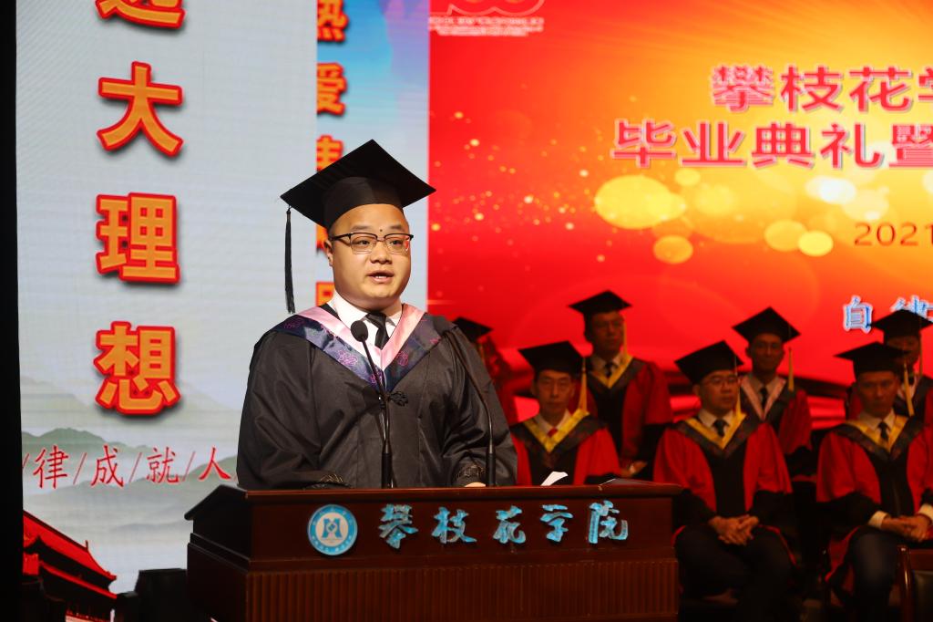 法学院毕业生刘瑞在发言中深情表示:与攀大相识,满心期待;与攀大相遇,无比激动;与攀大相知,满满回忆;与攀大相守,彼此成长。他代表广大毕业生表示,将始终牢记“明德砺志,博学笃行”的校训,将“自律攀大人”作为最深的勉励和终生的标签。