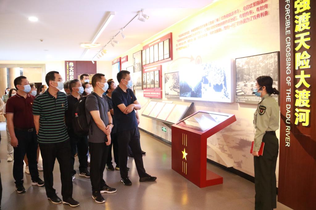 渡河时,敌人的手榴弹正好落在船上!在枪林弹雨、宽300多米水流湍急的大渡河上,10.5米、宽2.3米、高2.2米的小船只乘尖石堡‘千层浪’,载着17名勇士迈向胜利的彼岸,正是大渡河畔的翘首木船,在国民党军队口中‘不可逾越的大渡河撕开了一道缺口”在中国工农红军强渡大渡河纪念馆里,学员们认真地听着讲解,一件件文献实物、一张张历史图片,一段段文字记录把大家拉回到86年的红军长征的艰险历程,深刻体会“顾全大局、严守纪律、紧密团结的精神;就是紧紧依靠人民群众,同人民群众生死相依、患难与共、艰苦奋斗的精神”的长征精神