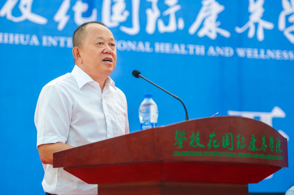 李建勤在讲话中代表市委、市政府热烈祝贺攀枝花国际康养学院落成开学,欢迎同学们走进国际康养学院学习生活。他指出,攀枝花是一座美丽的城市,是全国著名的阳光花城、康养胜地。省第十一次党代会对攀枝花作出了“建成攀西国家战略资源创新开发试验区和全国阳光康养旅游目的地”发展定位,市委、市政府深入贯彻落实省委部署,团结带领全市人民,充分发挥比较优势,全力做好“钒钛”“阳光”两篇文章,特别是高度重视“阳光”这篇文章,大力发展“康养+农业”“康养+工业”“康养+医疗”“康养+运动”“康养+旅游”五大“康养+”产业。在此背景下,攀枝花国际康养学院应运而生,标志着攀枝花“康养+医疗”在全国迈出了第一步。
