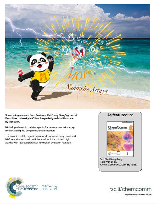 近日获悉,我校生物与化学工程学院蒋志强、李玉峰、朱学军教授团队以蒋志强为第一作者、攀枝花学院为第一单位在Royal Society of Chemistry旗下期刊《ChemicalCommunications(1区,2018IF=6.29)发表了题为《Ni(II)-doped anionic metal-organicframework nanowire arrays for enhancing the oxygen evolution reaction》的研究论文(2019, 55, 4023-4026),这是我校首篇在一区发表的封面论文。