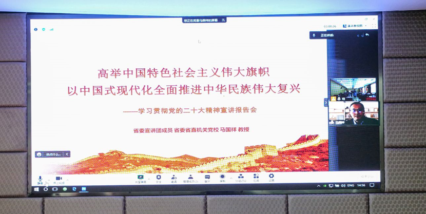 1228日下午,省委宣讲团成员、省委省直机关党校党建党史教研部主任马国祥教授通过线上视频为我校师生宣讲党的二十大精神。党委书记王斌,党委副书记胥刚,学校教师宣讲团成员及教学院部、机关教辅单位教师代表参会,会议由胥刚主持。