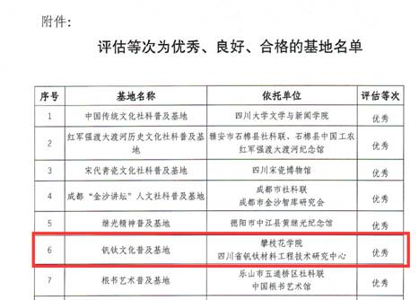 12月29日,四川省社科联公布了省级社科基地评估结果,全省57个社科基地中,共评出优秀17个、良好27个、合格13个。我校钒钛文化普及基地在评估中获评优秀。
