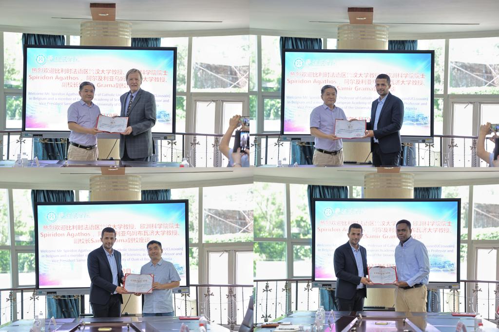 学校现场聘任Spyridon Agathos院士为名誉教授、Samir Grama教授为客座教授,乌姆布瓦济大学聘任我校李健教授、安澜副教授为客座教授。