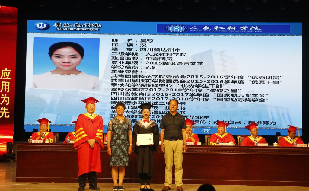 来自人文社科学院2015级汉语言文学专业的吴琼代表毕业生发言。她对母校的辛勤培养、老师的谆谆教导和同学的相知相伴表达了深深的感激和不舍之情,她表示,将会深深牢记习总书记在纪念五四运动100周年大会上对青年的寄语,志存高远,坚定信念,在各个工作岗位上,以攀大青年学子的学识、能力和气度,用汗水、用梦想,续写攀大故事、传播攀大声音、弘扬攀大精神、树立攀大自信、展示攀大水平!