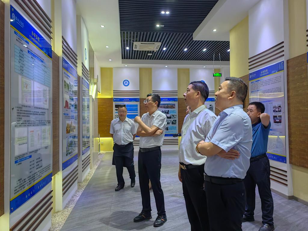 黄正富一行参观了校史馆,详细了解了学校发展历程、办学理念、办学定位以及基础设施建设、学科专业建设、师资队伍建设、产教融合发展、人才培养、教学成果等情况。