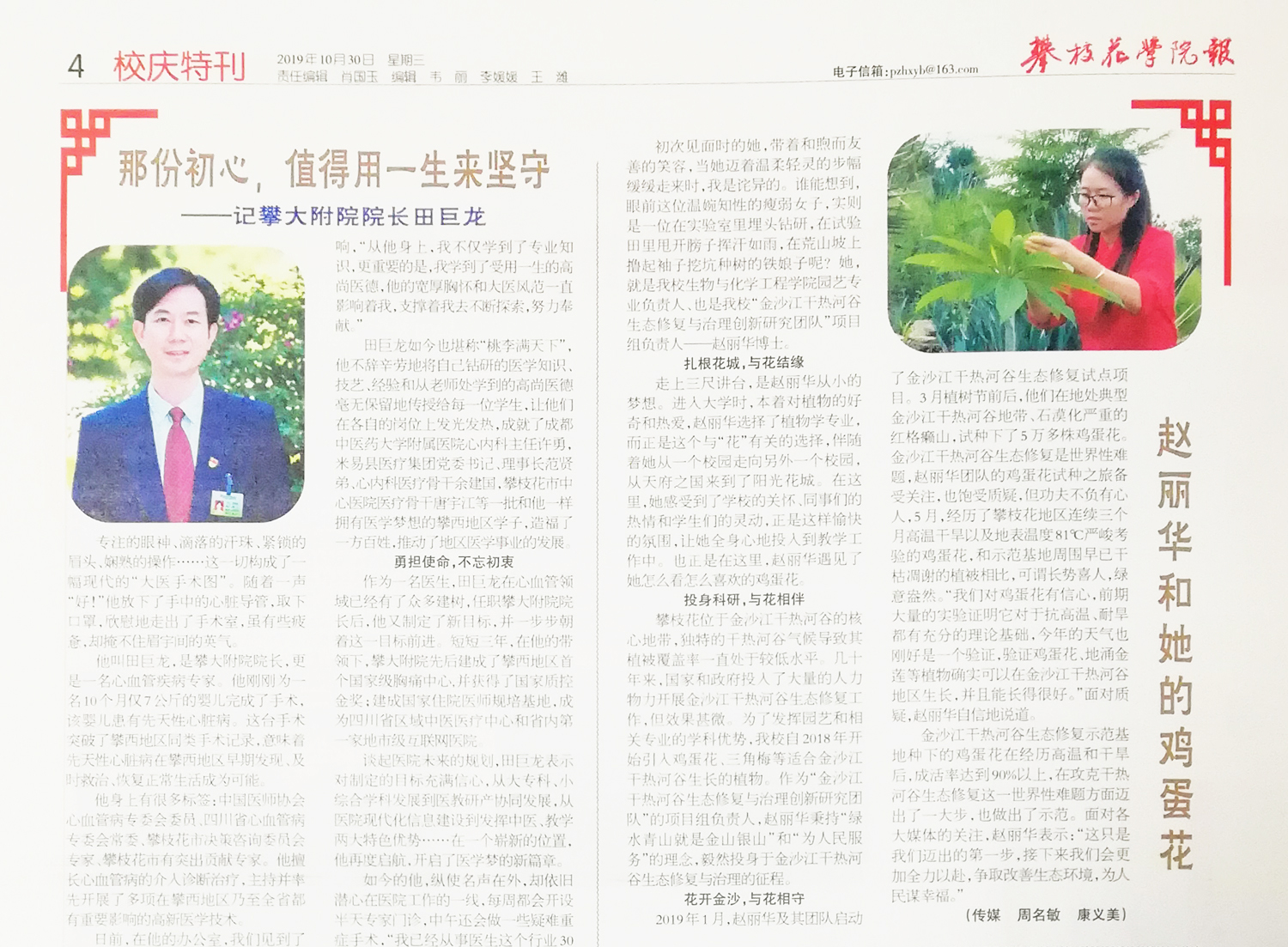 5月7日,《四川教育发布》微信公众号以《行程16000多公里,四川这所高校寻访58位校友》为题,5月21日《中国教育报》第四版,以《让青春绽放在祖国最需要的地方——攀枝花学院青年学子扎根边疆纪实》为题,报道我校青年学子志存高远、扎根边疆、报效祖国的感人故事。让我们攀大狠狠地刷了一次存在感,而对于关注了学校各大宣传平台的同学、校友、老师们来说,他们能看到的远不仅仅如此。一年以来,我们通过开展“边疆行”、“沿海行”“校友返校日”等采访宣传系列活动,讲好毕业校友故事。寻访百余名校友,集中大篇幅报道优秀典型20余名。一直战斗在阿克陶县脱贫攻坚一线的赵显勇、张宝贵,在墨脱做36个孩子的姐姐老师龚丽,在中央电视台、深圳电视台担任嘉宾律师的余刚,在西藏拉萨国家电网一呆就是10年的伍应衡,他们平凡动人的故事激励着学弟学妹、鼓舞着广大青年学子。策划开展了包括“新生专访”、“攀大出彩青年”、“校园之星”等一系列专访报道,讲好在校优秀学子故事。通过文字、图片、视频等多种形式展示他们出彩处、动人点,斩获第五届“互联网+”国家级银奖“以钢代钛——电子束镀钛”项目负责人袁丽团队,以366分考入武汉大学神经科的“热心学长”胡平,见义勇为、及时应急处置昏迷者的钱祖鑫,带着弟弟上学的徐一虹,以及马媛媛、向贤真、雷文刚、费浩东等一大批“校园之星”,成为了我们身边的榜样,激励引导青年学子爱国奋进、乐于奉献、开拓创新。