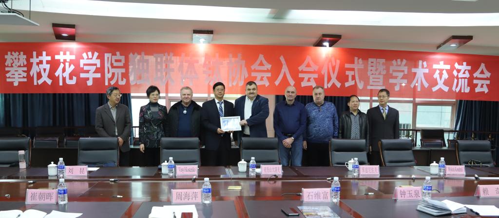 仪式上,石维富介绍了学校的基本情况,对Alexanderov一行表示欢迎。Alexanderov介绍了独联体钛协会情况,表示非常欢迎攀枝花学院加入协会,并期待与攀枝花学院在生产、研发方面开展深入交流合作。Alexanderov为我校授会员单位牌,石维富代表学校接牌。随后,双方围绕钛及钛合金领域的深度合作进行了沟通交流。