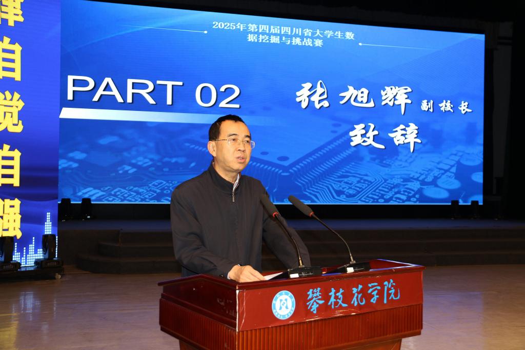 张旭辉代表承办单位致欢迎辞。他代表学校对全体嘉宾和参赛师生表示热烈欢迎。他指出数据作为新时代的关键生产要素和基础性战略资源,其价值的挖掘与应用正深刻改变着我们的生产生活方式,驱动着社会各领域的创新发展,希望青年学子在数据海洋中探索真知,锤炼创新能力,并预祝各参赛队伍赛出水平、展现风采。他表示,学校将以承办此次大赛为契机,持续深化“产教融合、赛教融合”,积极推动信息技术与教育教学、科学研究的深度融合,为四川建设国家数字经济创新发展试验区贡献攀枝花学院力量。