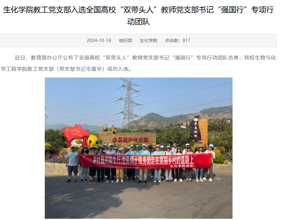 5生化学院教工党支部入选全国高校“双带头人”教师党支部书记“强国行”专项行动团队