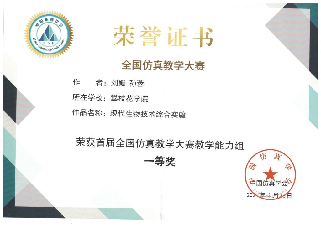 其中,学校获首届全国仿真教学大赛组织奖。刘姗、孙蓉团队作品《现代生物技术综合实验》荣获教学能力组一等奖;刘姗、孙蓉、彭徐、高静雷团队作品《葡糖基转移酶基因工程菌的构建及工艺条件的优化》荣获教学课件组二等奖;李学武、刘姗、孙蓉、张毅团队作品《SDS聚丙烯酰胺凝胶电泳测定蛋白质的相对分子量》荣获教学课件组二等奖;熊亚、朱学军、刘姗、孙蓉、王胜男团队作品《实时荧光定量PCR检测目的基因表达量》荣获教学课件组三等奖;孙蓉、刘姗、高静雷、刁毅团队作品《三角梅葡糖基转移酶基因功能验证》荣获教学课件组三等奖。