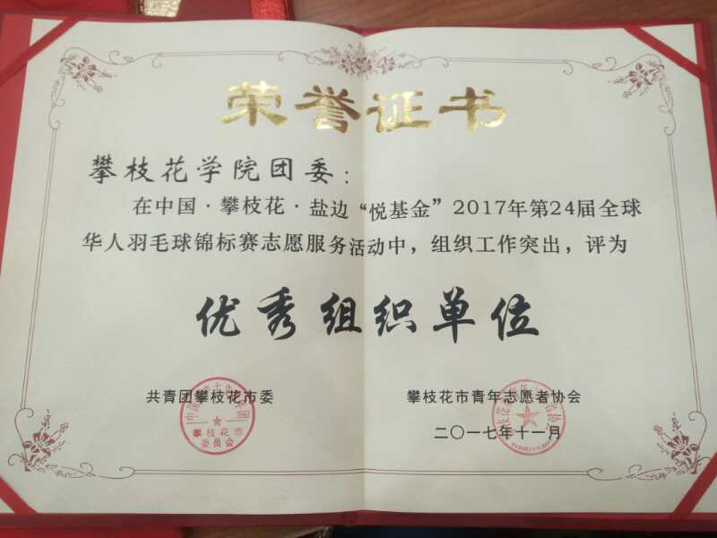 11月1——5日,中国·攀枝花·盐边“悦基金”2017年第24届全球华人羽毛球锦标赛在我市举行。我校共59名志愿者参与赛事服务,得到了运动员和主办方的高度认可。我校校团委荣获优秀组织单位奖,12名志愿者荣获优秀志愿者光荣称号。